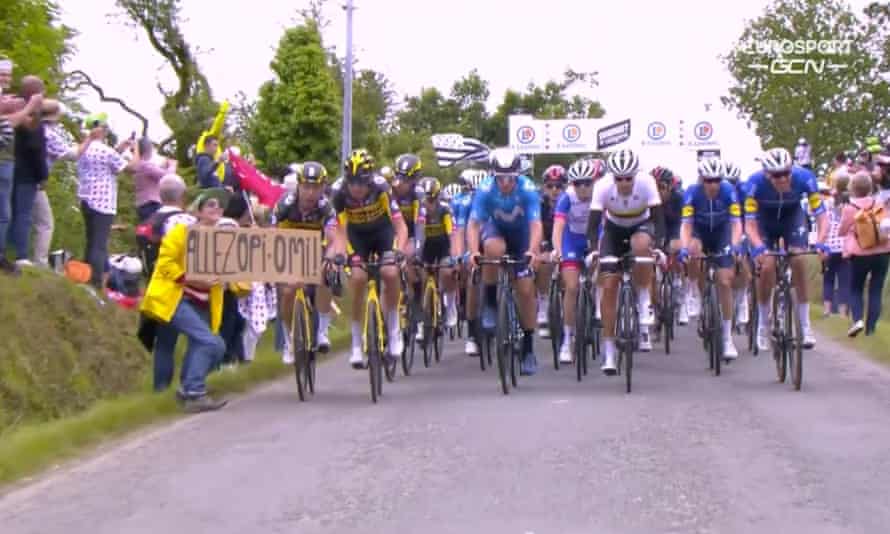 Somehow the rider was able to walk away from the scary wreck. The opening day of Tour de France was a mess with heavy rain and storms wrecking havoc. Usa today A spectator with a sign posing for a camera clipped a Tour de France bicyclist causing the rider to crash and start a massive pile-up in Stage 1 on Saturday.